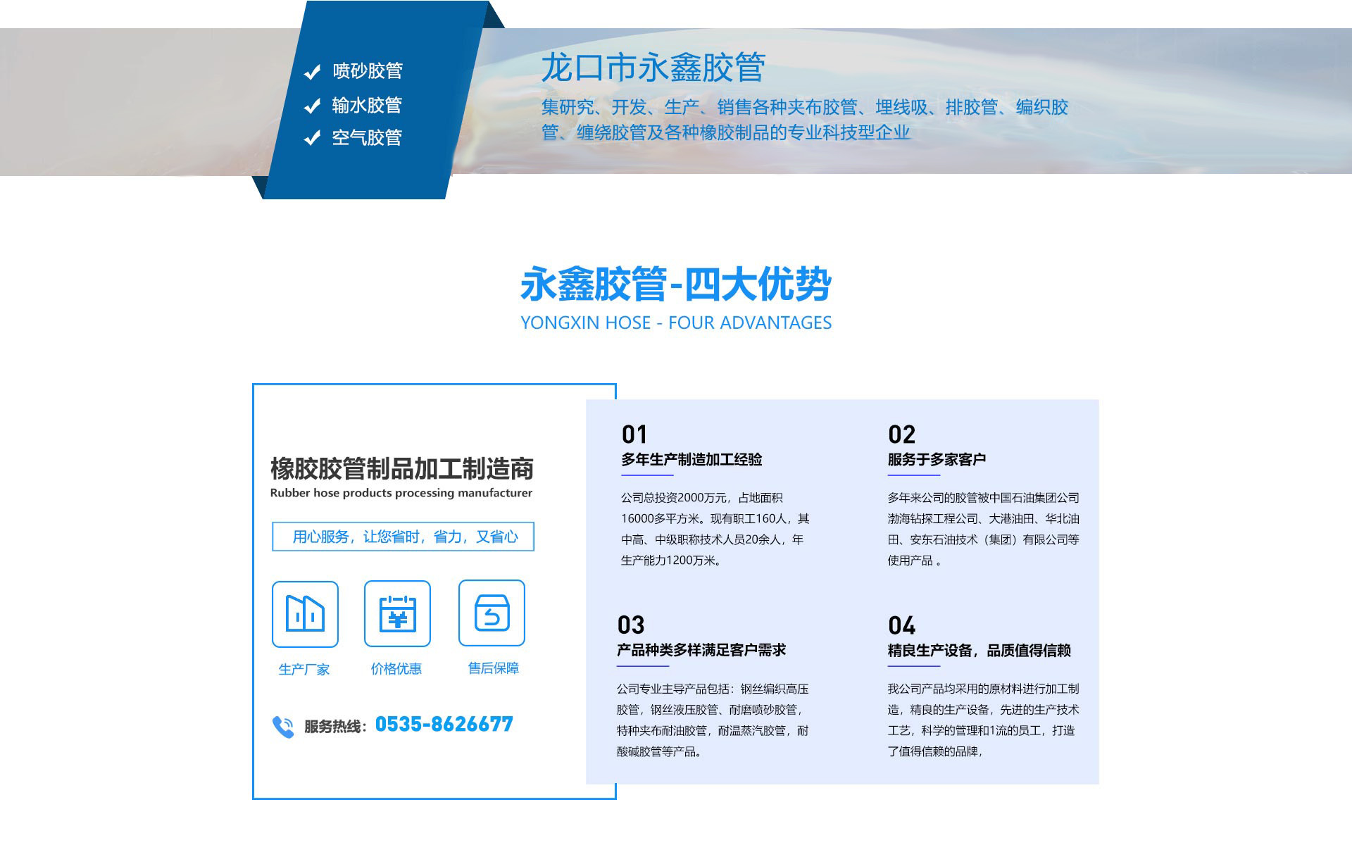 龍口市永鑫膠管有限公司始建于1979年。位于山東半島北端——龍口市,毗鄰龍口港、威烏高速公路和大萊龍鐵路,商業(yè)運輸,交通方便,地理位置好。公司總投資2000萬元,占地面積16000多平方米。現(xiàn)有職工160人,其中高、中級職稱技術(shù)人員20余人,年生產(chǎn)能力1200萬米。多年來公司的膠管被中國石油集團公司渤海鉆探工程公司、大港油田、華北油田、安東石油技術(shù)(集團)有限公司等使用產(chǎn)品我公司迎著十八界三中全會的改革大潮始終闊步向前,目前我公司主要從事高低壓橡膠軟管、鉆探膠管、夾布膠管、噴砂膠管、橡膠管帶制品,等產(chǎn)品的生產(chǎn)和研發(fā),主導(dǎo)產(chǎn)品包括:生產(chǎn),研制高低壓橡膠軟管、輸送皮帶等以橡塑為主的產(chǎn)品,擁有各類進口,國產(chǎn)生產(chǎn)設(shè)備120多臺套,化驗,分析,試驗儀器設(shè)備種類多,檢測手段完善。我公司產(chǎn)品均采用的原材料進行加工制造,精良的生產(chǎn)設(shè)備和穩(wěn)定技術(shù)工藝,科學(xué)的管理,打造了客戶信任的牌子,先后與多家石油、化工、汽車制造等大型國有企...